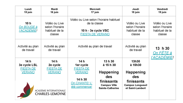Pour vous aider, les enseignants vous suggéreront un horaire hebdomadaire. Celui-ci est à titre d’exemple et a pour but de permettre aux parents de concilier leur emploi du temps et d’organiser les apprentissages, selon une réalité propre à chacun.